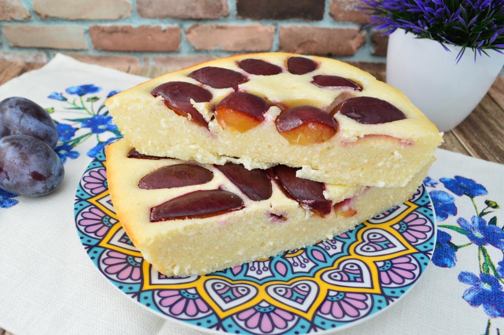 А вот как выглядит творожная запеканка со сливами в разрезе.