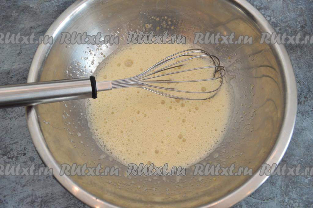 Венчиком энергично взбить яйца с сахаром до побеления массы (взбивать в течение 1-2 минут).