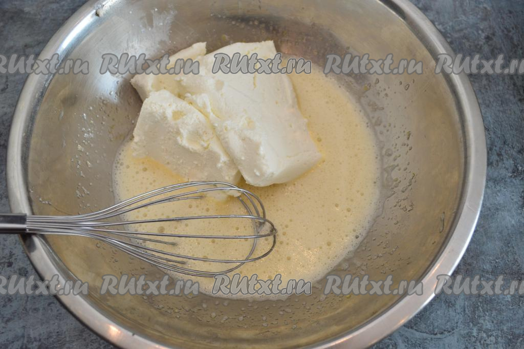 К яичной смеси добавить творог, перемешать до однородности.