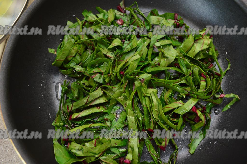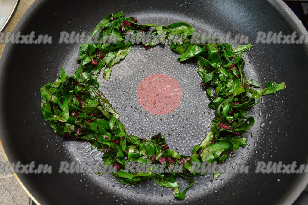 Сковороду разогреть вместе с растительным маслом. Выложить нарезанную свекольную ботву на сковороду, присолить и поперчить по вкусу. Обжарить ботву на среднем огне, постоянно помешивая, до уменьшения в объёме (я обжариваю в течение 1 минуты).