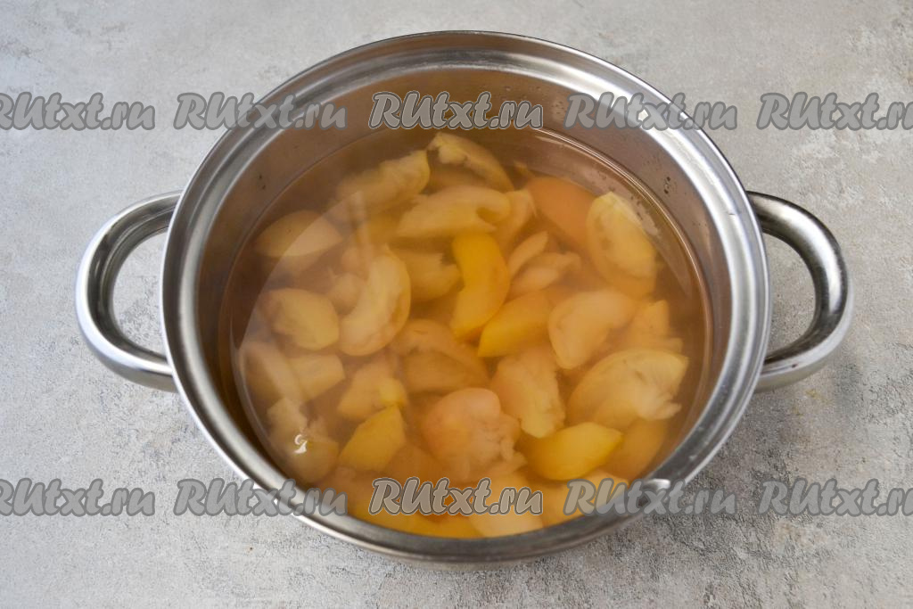 Яблоки тщательно вымойте, разрежьте на дольки, удалите семенные коробочки, кожуру я срезать не стала. 300 грамм подготовленных яблок сложите в кастрюлю.