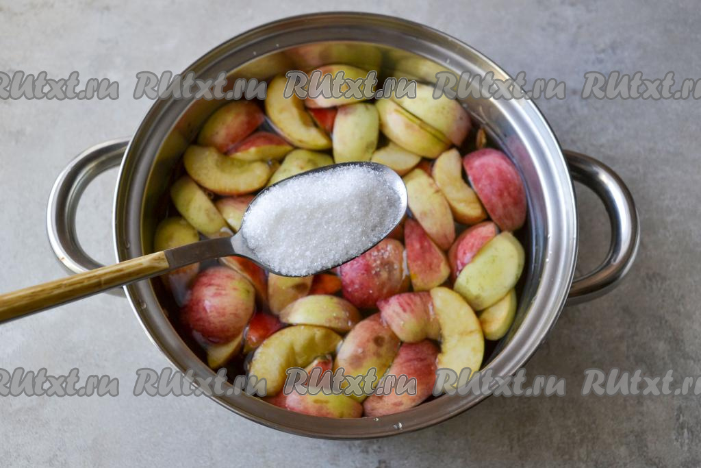 Добавьте сахар и поставьте кастрюлю на огонь. Я добавила 3 полных столовых ложки сахара и готовый кисель получился в меру сладким, но важно ориентироваться на сладость яблок и свои вкусовые предпочтения.
