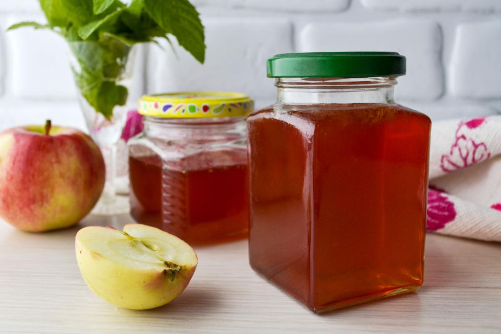 Остывший яблочный сироп хорошо желируется, несмотря на то, что готовился он без добавления желатина. Баночки с желе храните до зимы в прохладном помещении (например, в погребе, подвале или холодильнике).