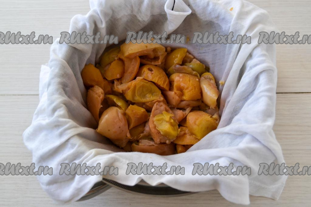 Дуршлаг застелите марлей, сложенной в несколько слоёв (или хлопчатобумажной тканью). Дуршлаг поставьте на ёмкость, в которую будет стекать яблочный отвар. Всё содержимое кастрюли вылейте в застеленный дуршлаг. Яблочную массу оставьте в дуршлаге на несколько часов (я оставила на всю ночь), чтобы яблочный отвар максимально стёк с яблок. Протирать яблоки не нужно, чтобы желе не получилось мутным.