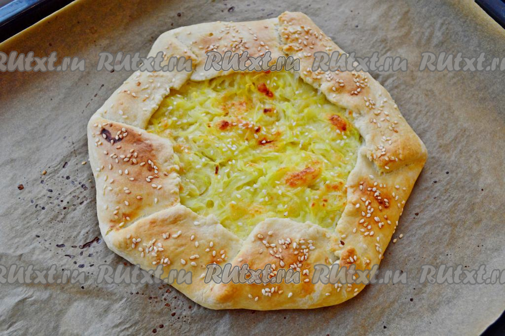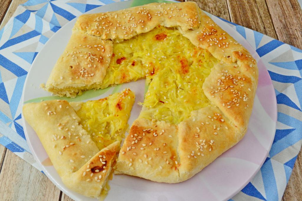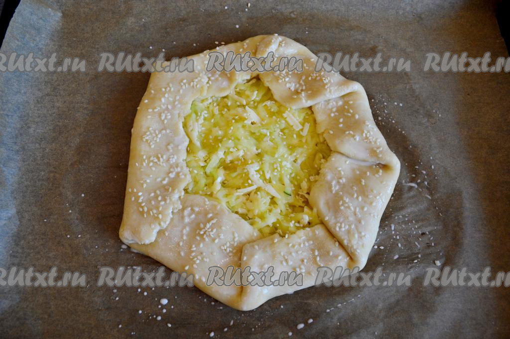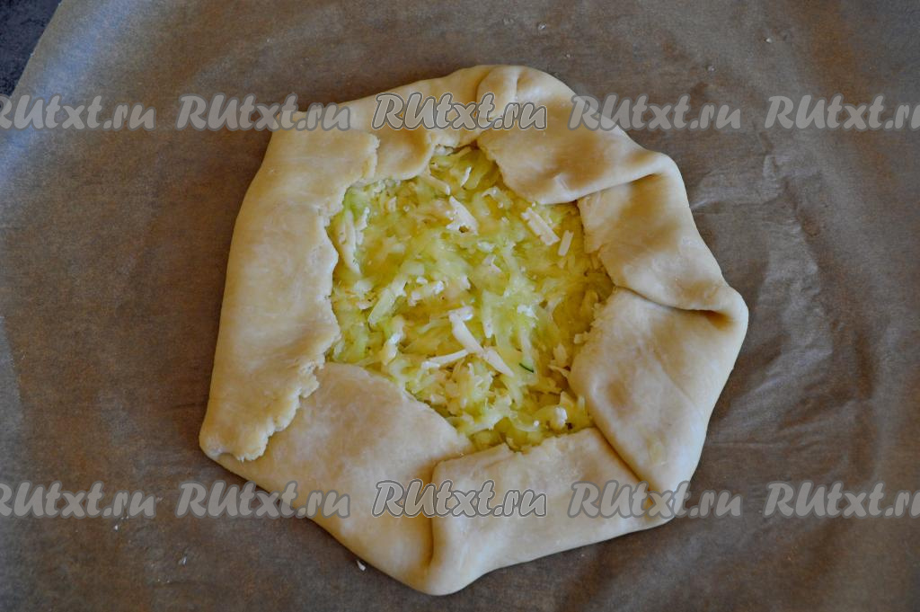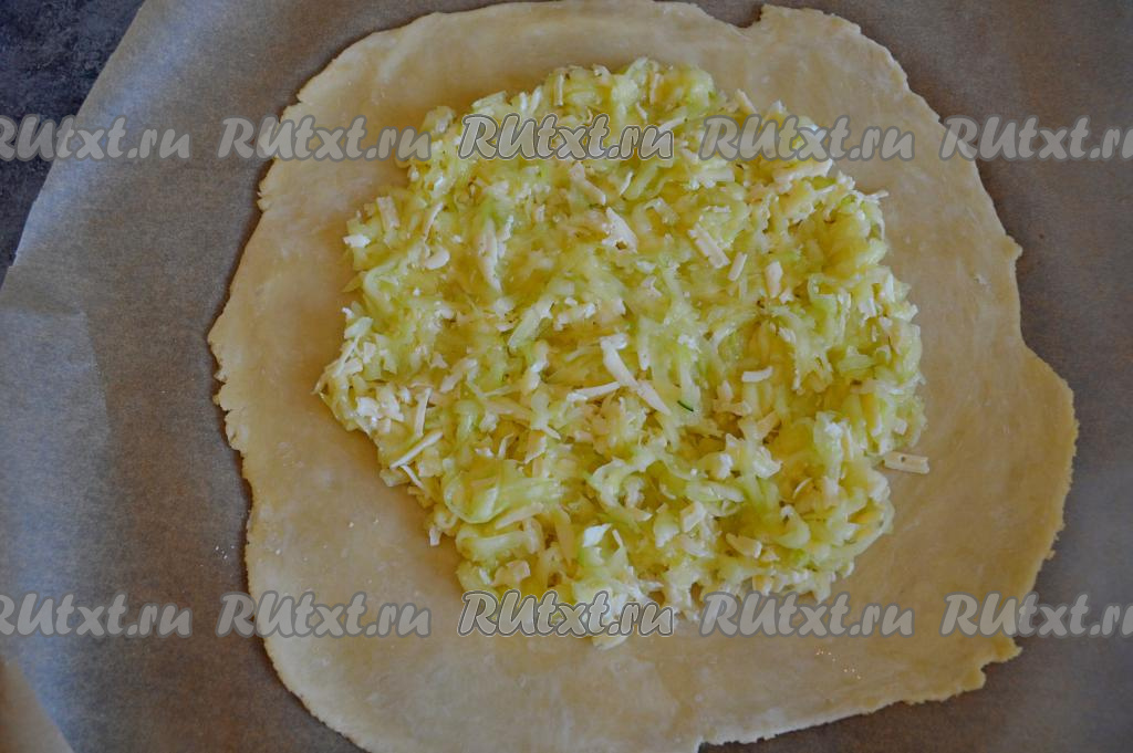 Достать тесто из холодильника. Застелить стол пергаментом и прямо на пергаменте раскатать тесто в круг толщиной примерно 2-3 миллиметра. В центр раскатанного круга, отступив от краёв по 3-4 сантиметра, равномерно выложить кабачково-сырную массу.