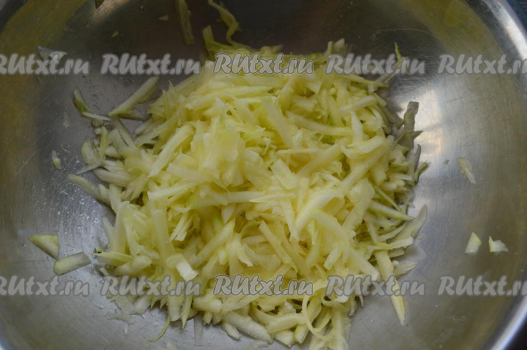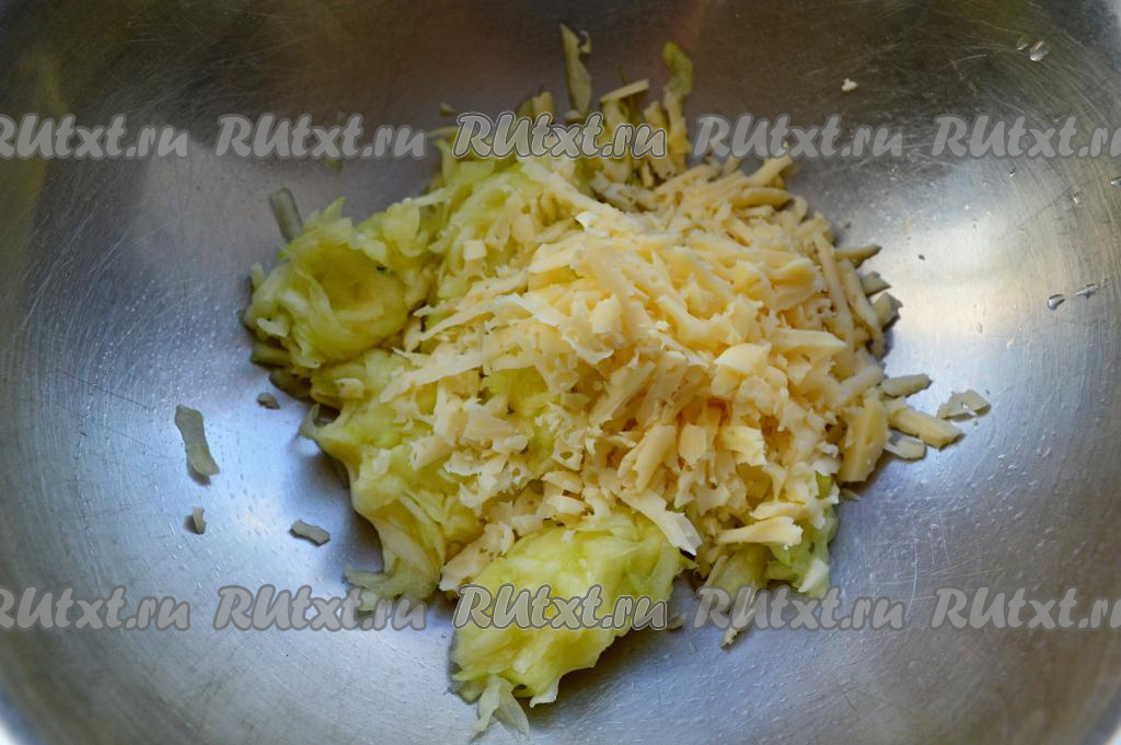 По истечении 10 минут кабачок выделит достаточно много сока. Хорошо отжать кабачковую массу руками, убирая сок. К кабачку, отжатому от сока, добавить твёрдый (или полутвёрдый) сыр, натёртый на крупной тёрке, перемешать кабачково-сырную массу до однородности.