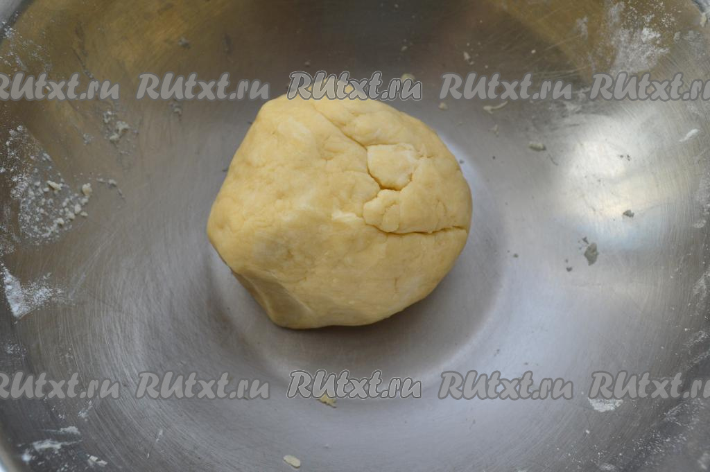 В получившуюся песочную крошку влить 3 столовых ложки холодной воды, вмешать её в тесто. Затем вливайте по 1 столовой ложке холодной воды, каждый раз тщательно вмешивая её и собирая тесто в ком. Как только тесто соберётся в ком, станет мягким и практически не липнущим к ладоням, значит больше добавлять воду и вымешивать тесто не нужно. В этот раз у меня ушло 6 столовых ложек воды, но многое зависит от качества масла и муки. Миску с тестом накрыть и поместить в холодильник на 20 минут.