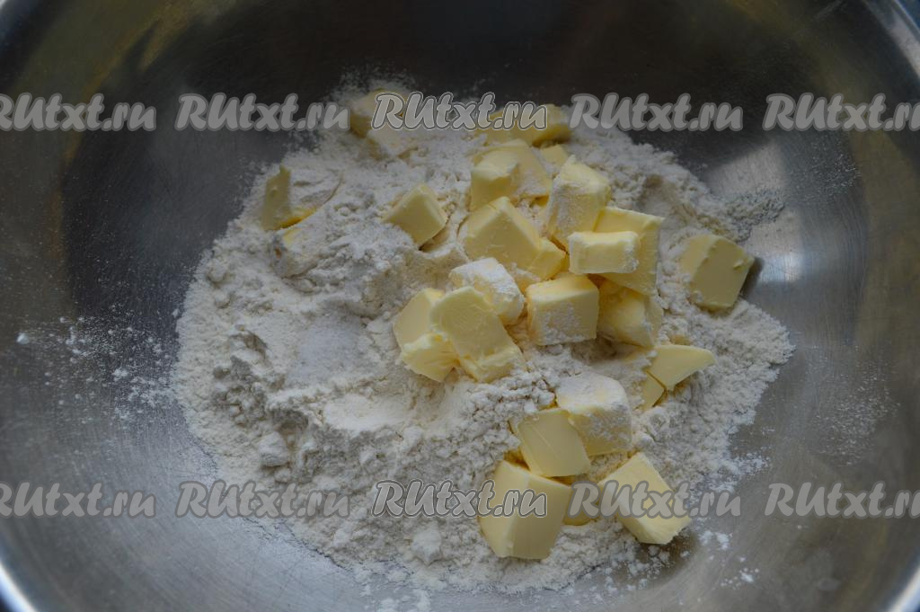 Муку с маслом перетереть в миске руками до получения мелкой крошки.