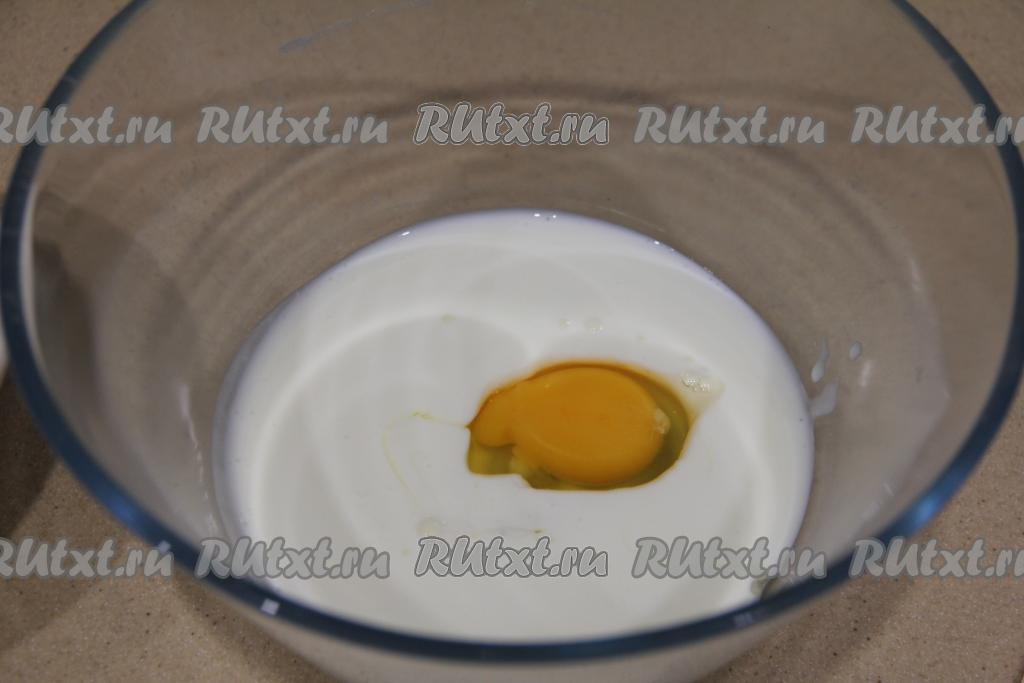 В глубокую миску влить кефир, добавить в него сырое яйцо, перемешать.