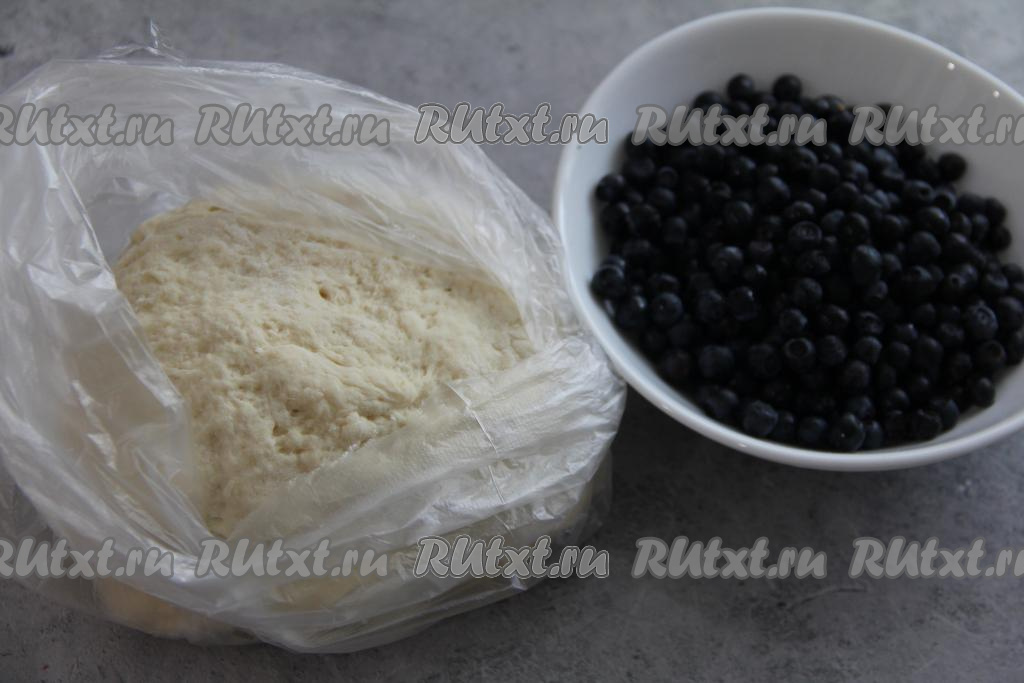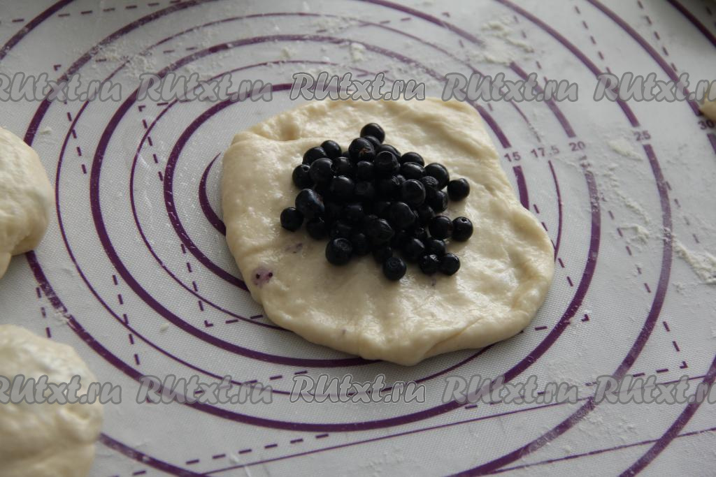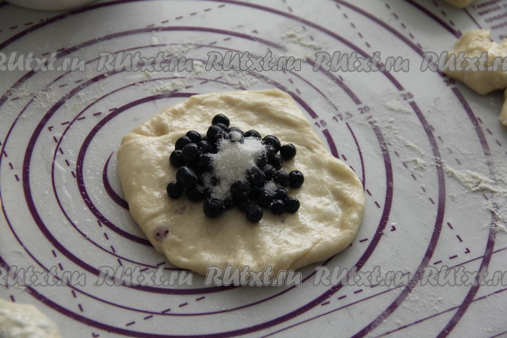 По прошествии времени разделить тесто на 10 частей. Из каждой части теста на припылённой мукой рабочей поверхности сформировать руками круглую лепёшку. Чтобы легче было работать с тестом, руки можно смазать растительным маслом. Выложить в центр лепёшки 2 чайных ложки черники.