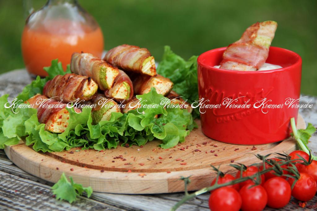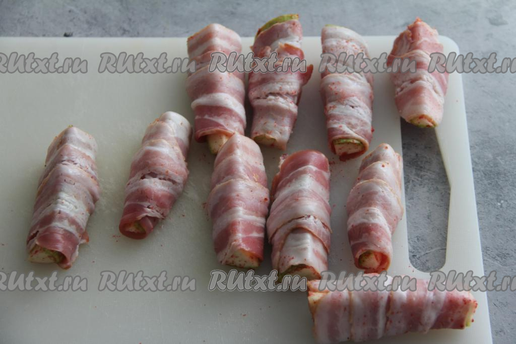 Каждый брусок кабачка завернуть в полоску бекона.