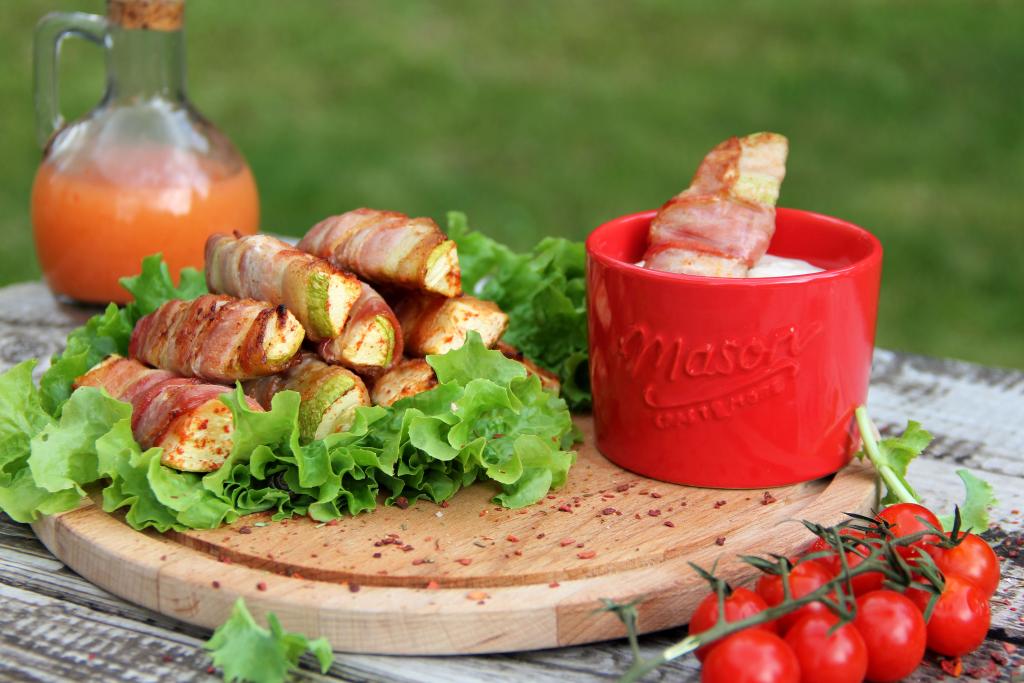 Предлагаю пожарить на мангале брусочки кабачков, завёрнутые в бекон. Это блюдо станет отличным перекусом перед подачей шашлыка. Сочетание кабачков и бекона - очень удачное, поэтому сочная, нежная и очень вкусная закуска, приготовленная по этому рецепту, всегда съедается с огромным удовольствием.