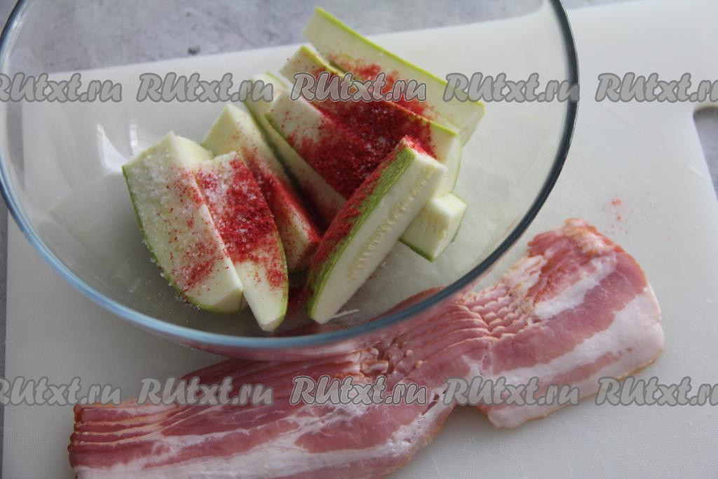 Поместить кабачки, нарезанные на брусочки, в миску, добавить специи (я взяла паприку) и соль, перемешать и оставить минут на 10. Затем откинуть на дуршлаг, чтобы удалить выделившийся сок. Разделить на полоски бекон.