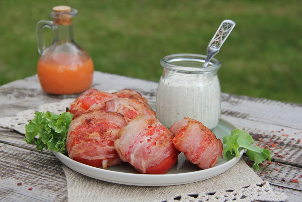 Разрезать помидоры на две части, удалить плодоножку. Обернуть каждую половинку помидора в полоску бекона.