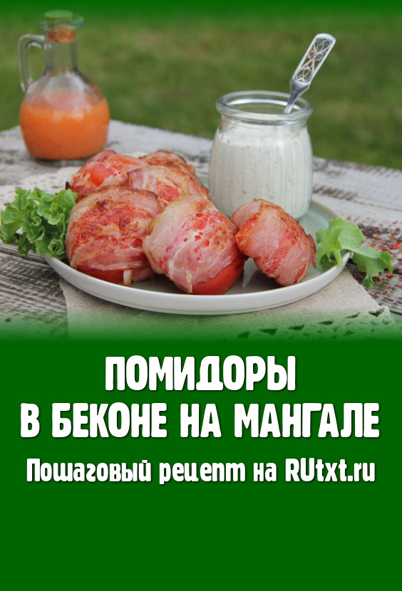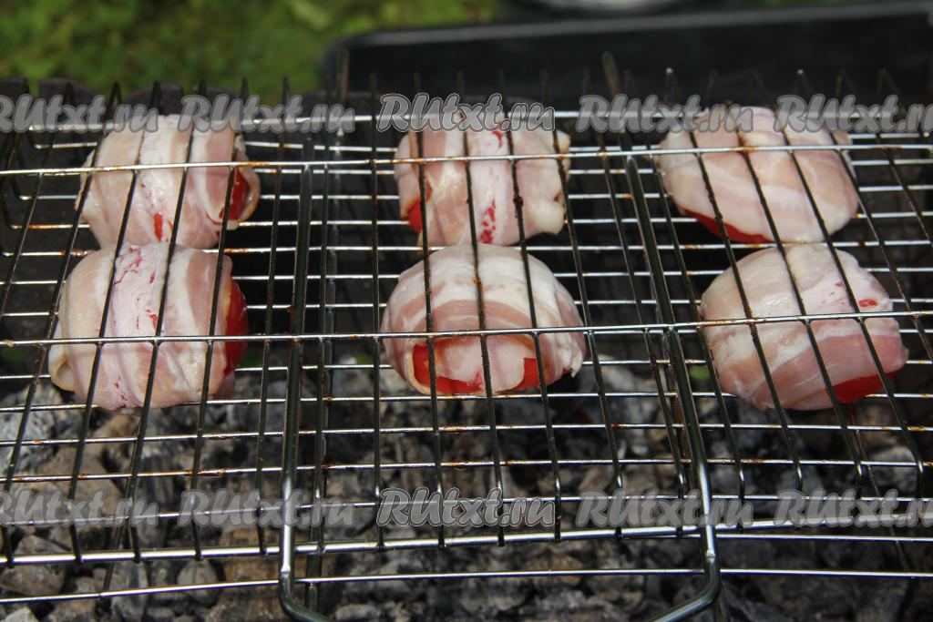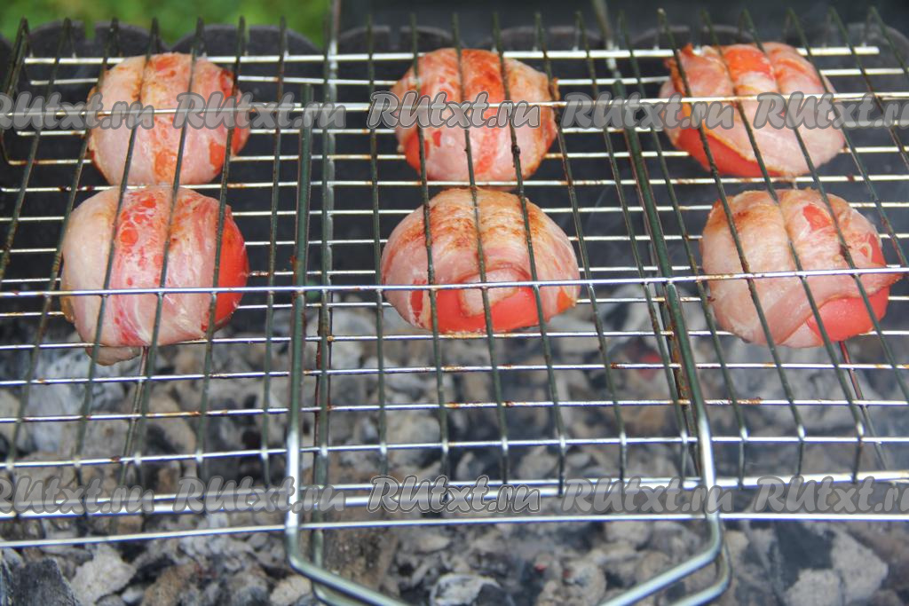 К моменту жарки помидоров в мангале должны быть очень горячие угли, но прямого огня быть не должно. Половины помидоров, завёрнутые в бекон, выложить на решётку и поместить на подготовленный мангал.