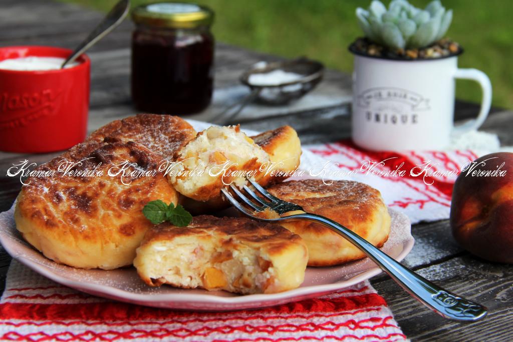 Жарить сырники с персиком на среднем огне с двух сторон до золотистого цвета (примерно по 2-3 минуты с каждой стороны).