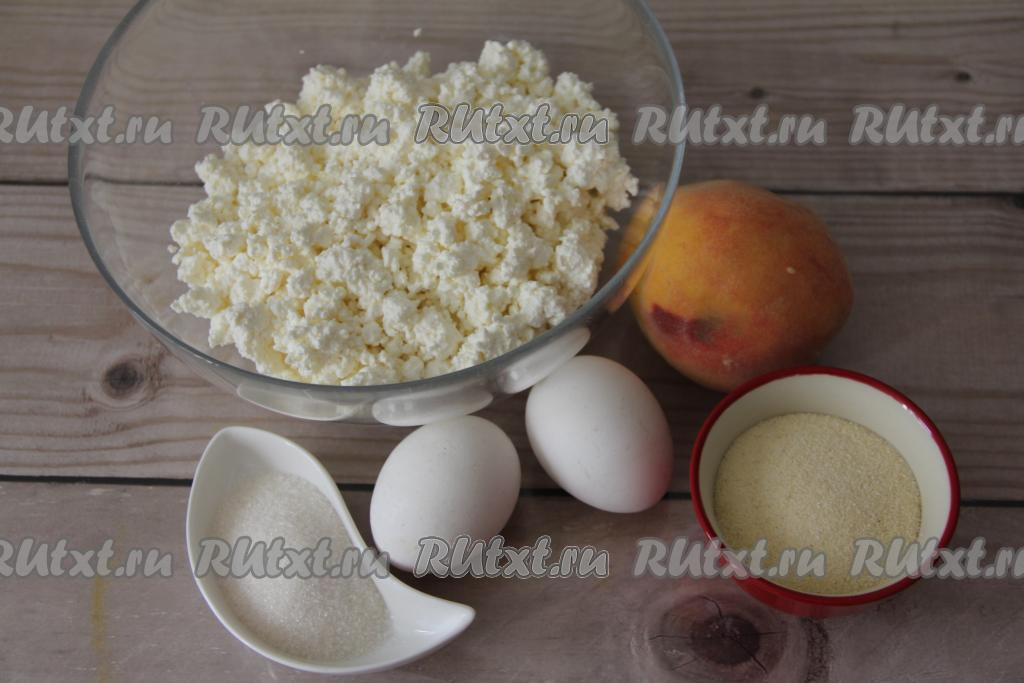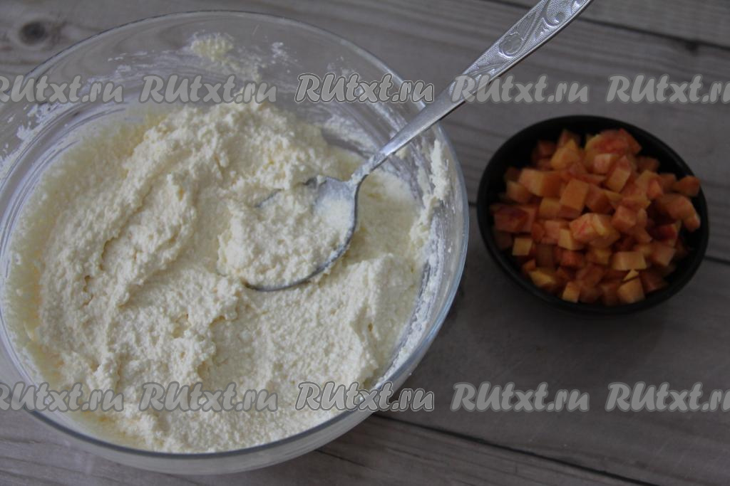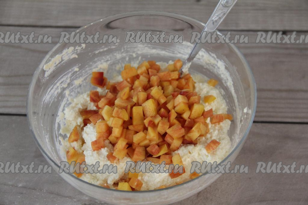 Персик нарезать на мелкие кубики и добавить в творожное тесто.