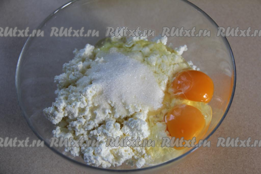 Соединить творог, яйца и сахар в миске, удобной для взбивания. Если творог влажный, тогда достаточно будет добавить одно яйцо.