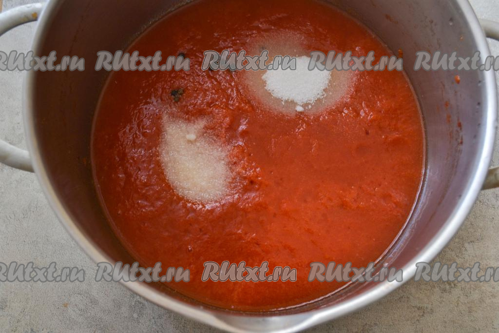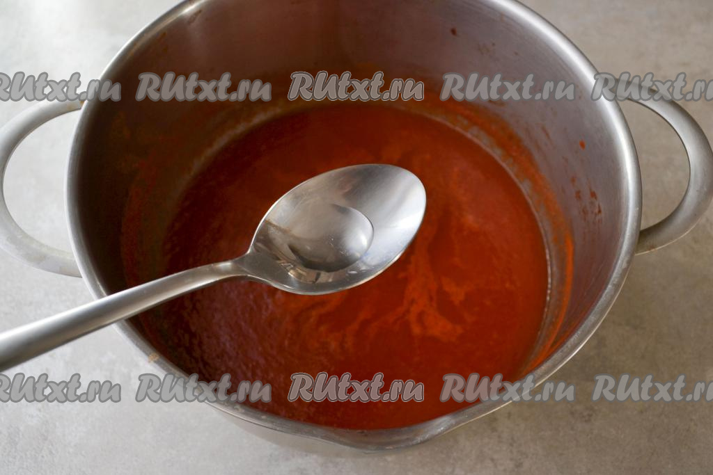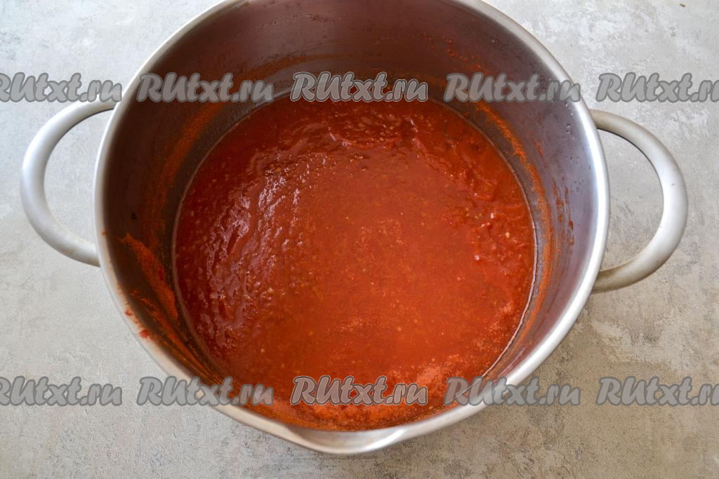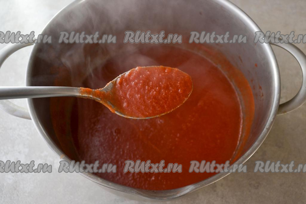 Поставьте кастрюлю с томатной массой на плиту. Доведите до кипения, сделайте огонь чуть ниже среднего и варите 20-25 минут, не накрывая крышкой и периодически перемешивая.