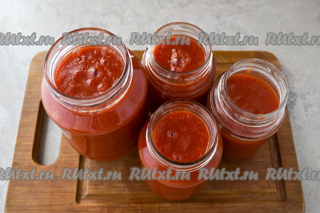 Заранее простерилизуйте банки (простерилизовать можно в микроволновке, духовке или в кастрюле над паром). Крышки тоже нужно будет заранее прокипятить в течение 3 минут с момента закипания воды и оставить в кипятке до закатки. В простерилизованные банки разлейте горячий кетчуп и сразу закрутите крышками.