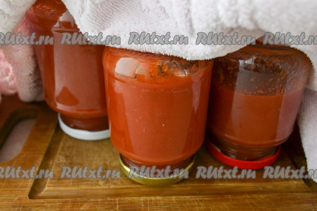 Переверните банки с кетчупом вверх дном, чтобы проверить герметичность закрытия, затем укутайте в плед (или одеяло) и оставьте на сутки.