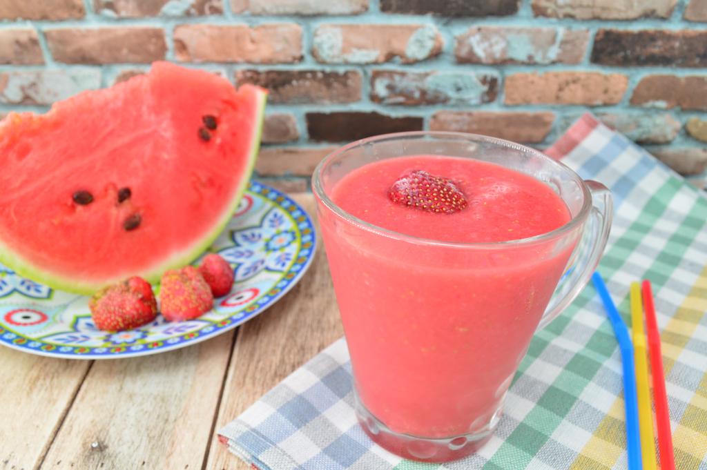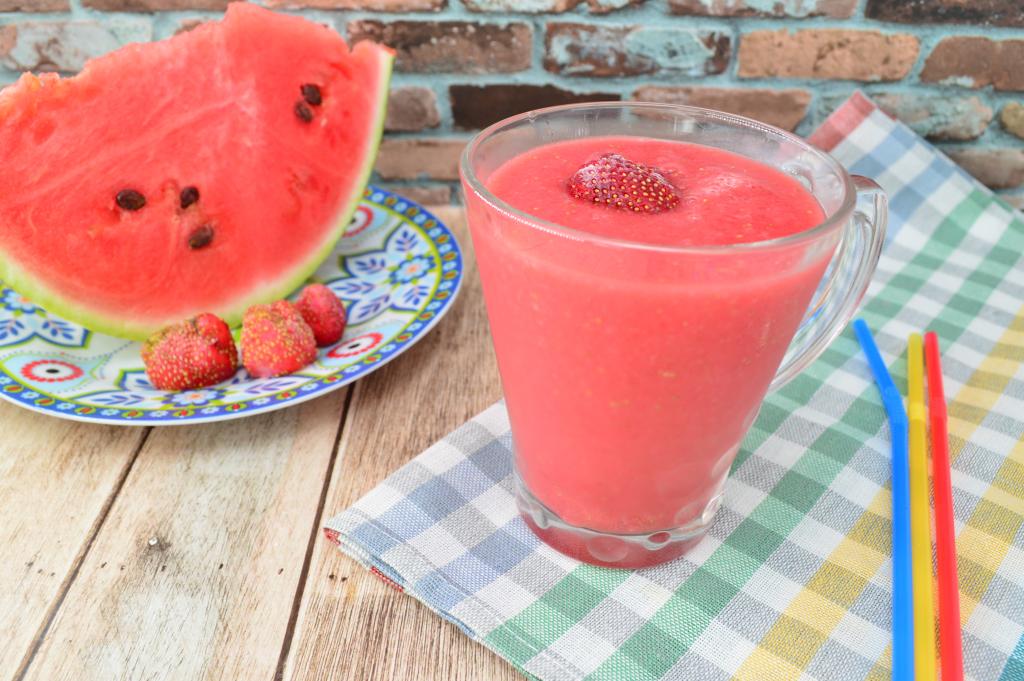 Предлагаю из клубники и арбуза приготовить вкусный, яркий, полезный смузи. Мёд и сахар я в напиток не добавляю, но многое зависит от сладости ягод, которые вы используете. Арбузно-клубничный смузи лучше готовить на один раз, я делаю такой напиток на завтрак или во время полдника, очень полезно и вкусно!
