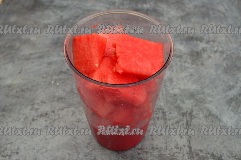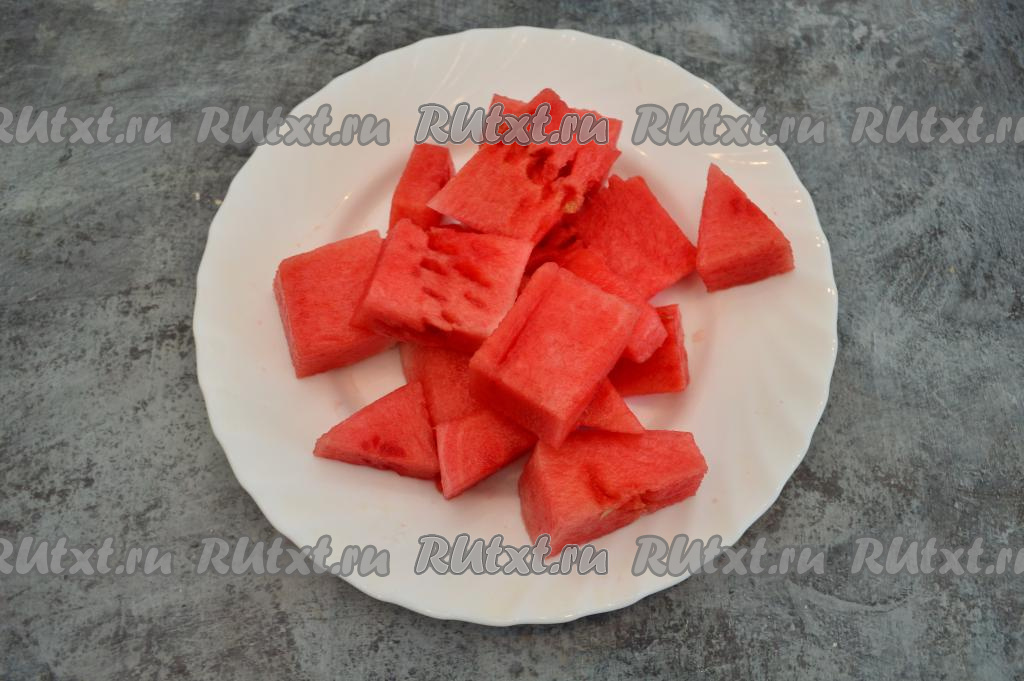 Арбуз отделить от кожуры. Мякоть арбуза нарезать на кусочки, убирая все косточки. В результате у меня получилось 400 грамм очищенного арбуза.
