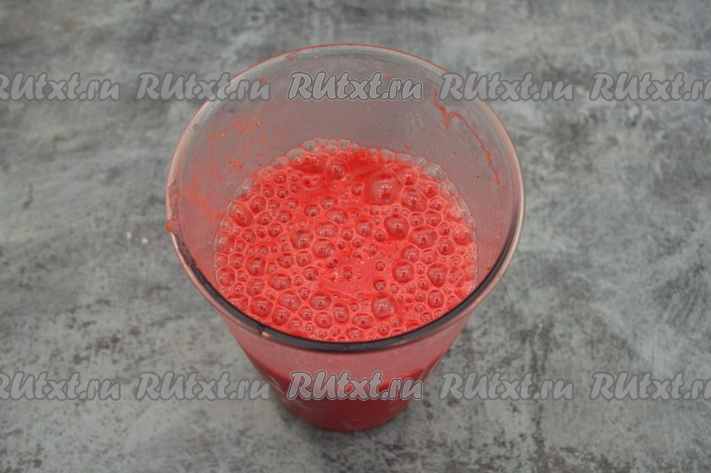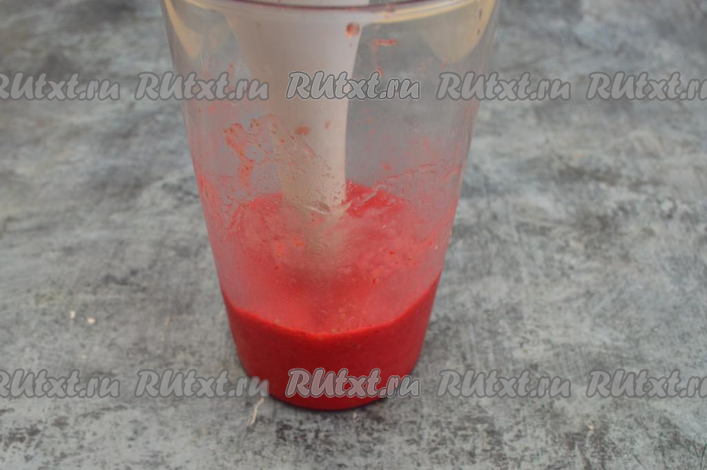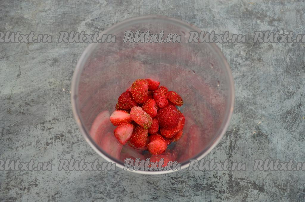 Пробить клубнику до однородности погружным блендером (я пробивала около минуты).
