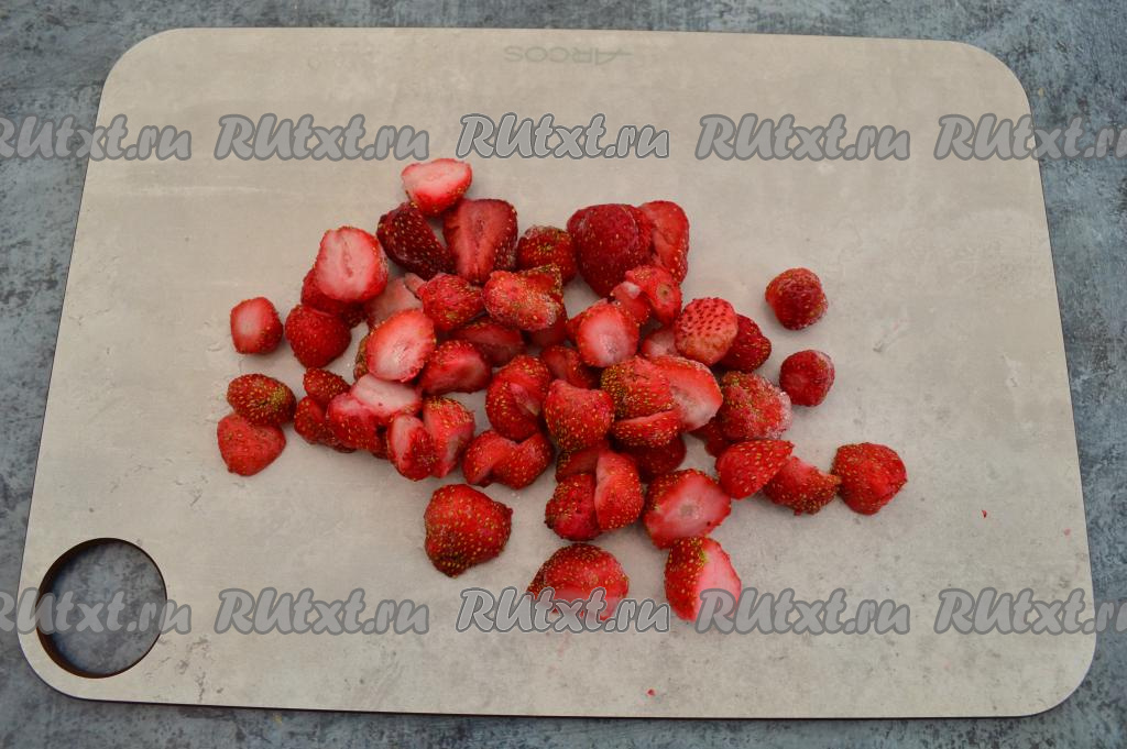 Слегка размороженную клубнику разрезать на части, чтобы её легче было пробивать погружным блендером. Свежие ягоды можно оставить целыми.