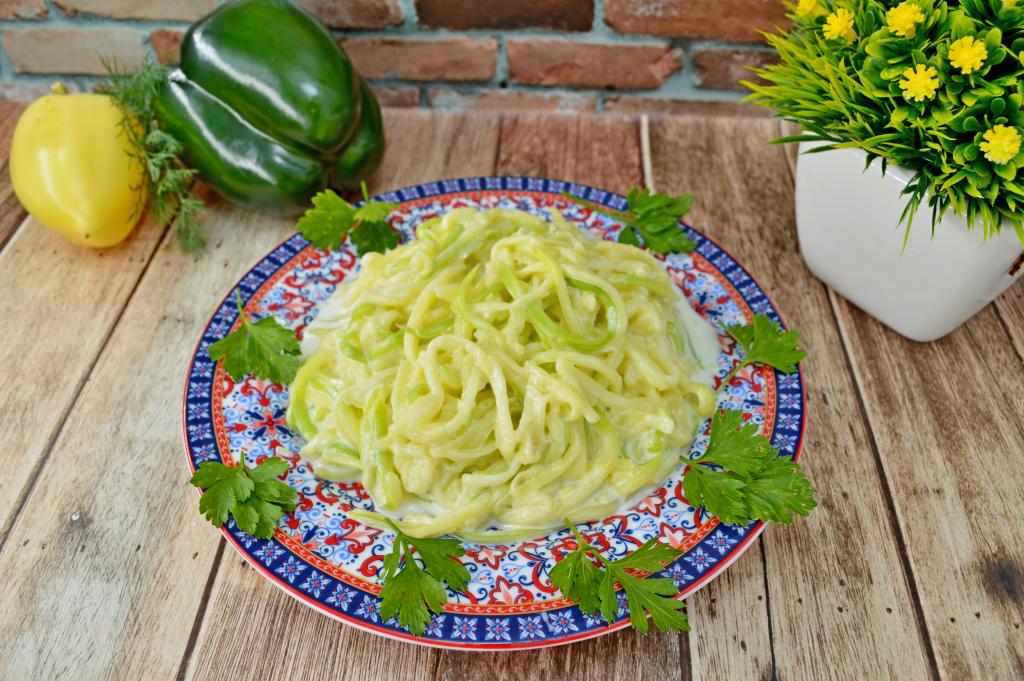 Спагетти из кабачков чем-то внешне напоминают классические спагетти, но готовятся конечно же совершенно по-другому и намного быстрее. Сегодня будем готовить кабачковые спагетти с добавлением творожного сыра. Это нежное, яркое, аппетитное блюдо можно будет подать к столу буквально через 7-10 минут. Такие спагетти в сочетании с творожным сыром станут и отличным гарниром, и великолепным самостоятельным блюдом. Я готовила спагетти из кабачков без специй, вы же можете добавить свои любимые специи для овощей.