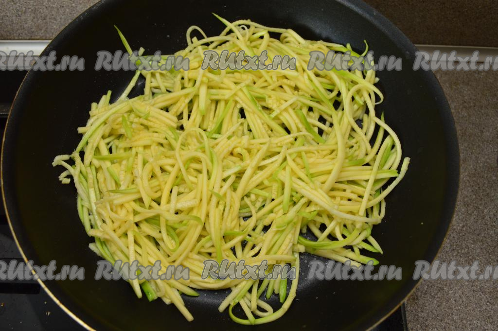 Сковороду хорошо разогреть. Влить растительное масло. С кабачков слить жидкость. Выложить натёртые кабачки на сковороду. Обжаривать спагетти из кабачков 3 минуты на среднем огне, иногда помешивая. Через 3 минуты кабачки будут готовы, они станут мягкими, но при этом будут хорошо держать форму.