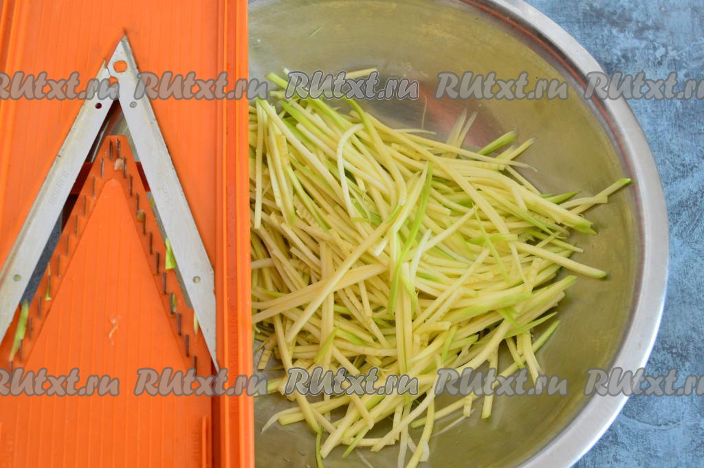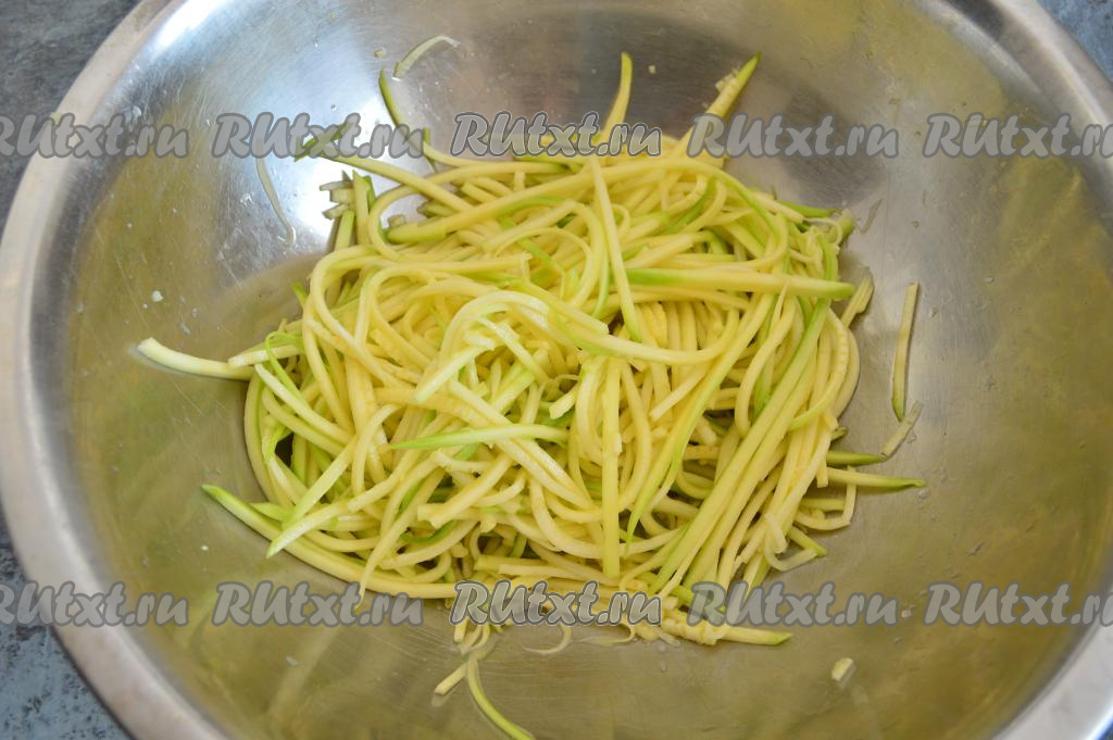 Кабачок хорошо промыть, удалить хвостики и очистить от кожуры. Нарезать кабачок на тёрке для корейской морковки. Получится кабачковая стружка, которая будет внешне напоминать спагетти.