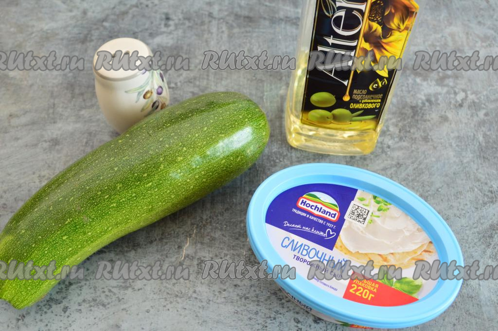 Подготовить продукты. Кабачок нужно брать молодой, без крупных семечек. Творожный сыр можно взять классический или с добавками на ваш вкус.