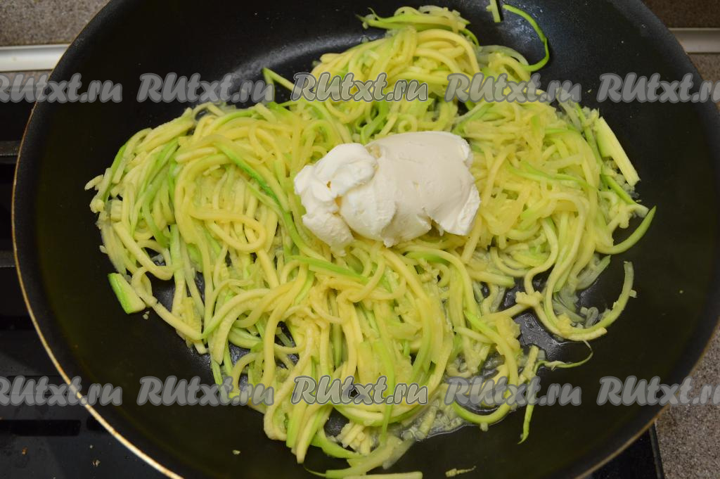 Перемешать кабачковые спагетти с творожным сыром и прогреть до полного расплавления сыра (ориентировочно в течение 1,5 минут).
