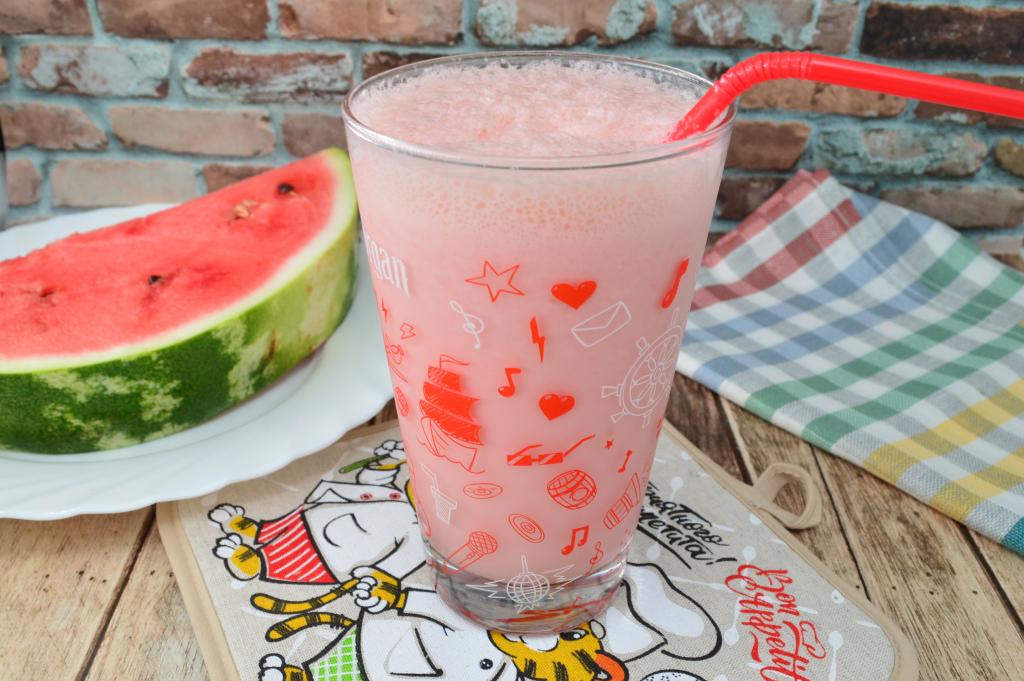 Вкусный, аппетитный, приятно освежающий молочный коктейль, приготовленный с арбузом и мороженым, сразу разлить по стаканам и подать к столу. Из указанного количества ингредиентов получается примерно 600 миллилитров коктейля.