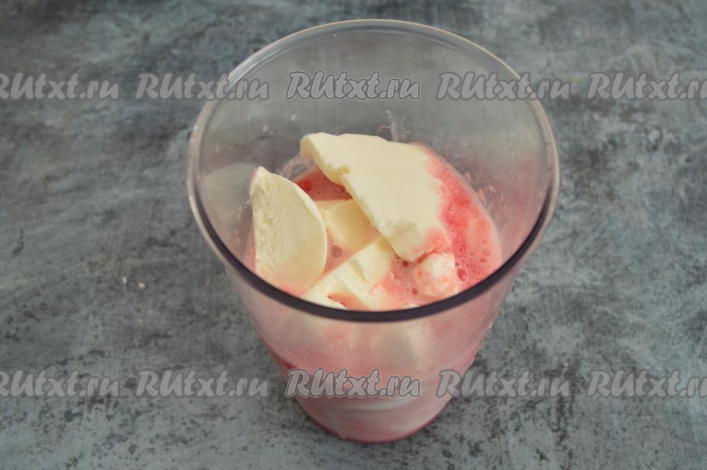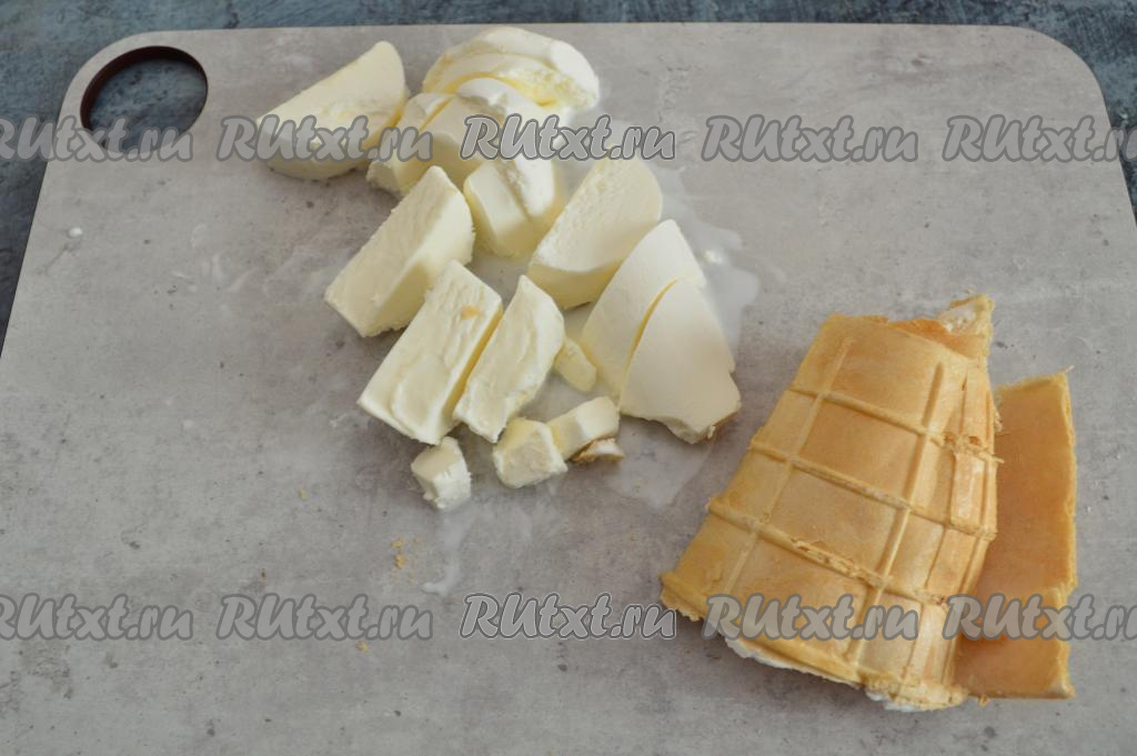 Если мороженое в вафельном стаканчике, тогда вначале удалите этот стаканчик. Мороженое нарезать на крупные кубики.
