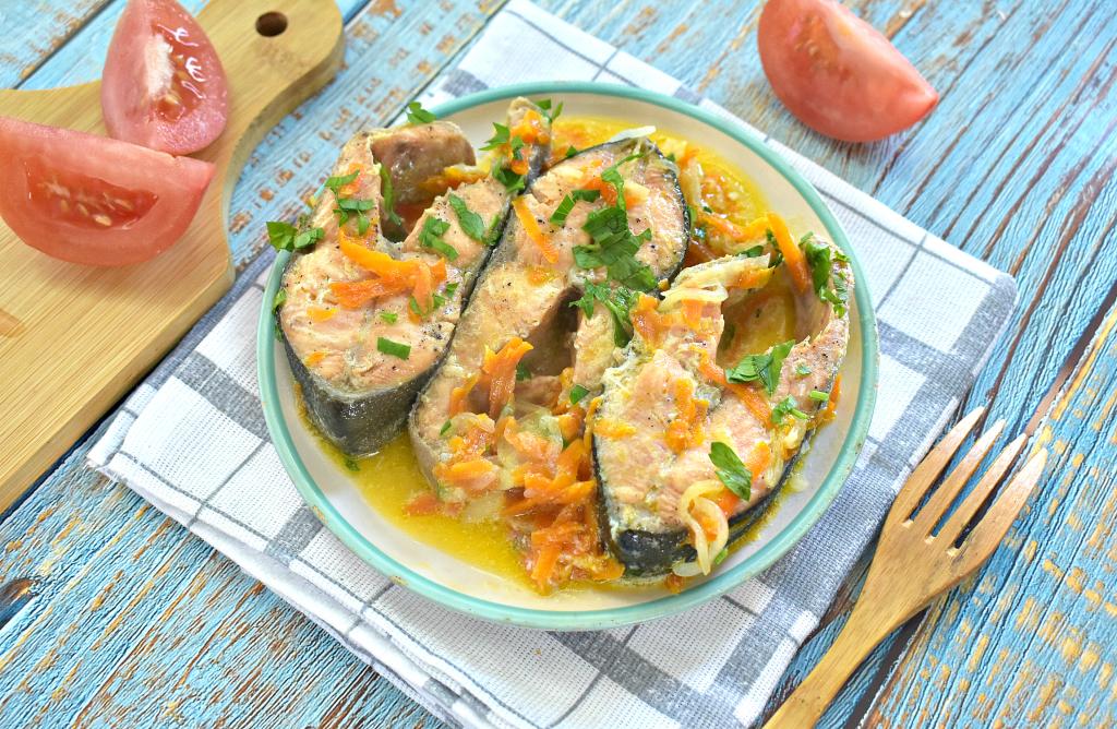 Стейки горбуши выкладываем на сковороду поверх обжаренных овощей.