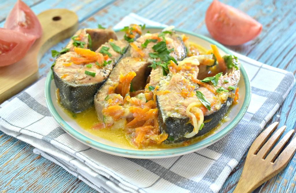 Сочную, мягкую, аппетитную горбушу вместе с луком и морковью раскладываем со сковороды по тарелкам и подаём к столу с гарниром, поливая соусом из сметаны, в котором тушилась рыба. Мне нравится подавать такую рыбку с картофельным пюре.