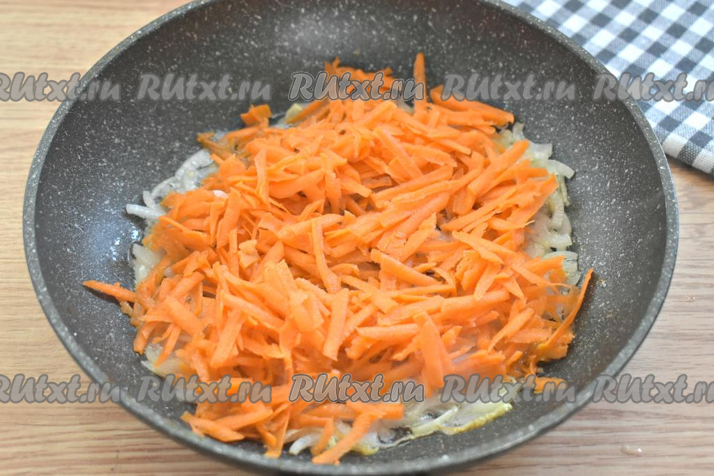 Затем добавляем морковку, натёртую на крупной тёрке, перемешиваем овощи и обжариваем их 4-5 минут (морковка должна стать мягкой), иногда помешивая.