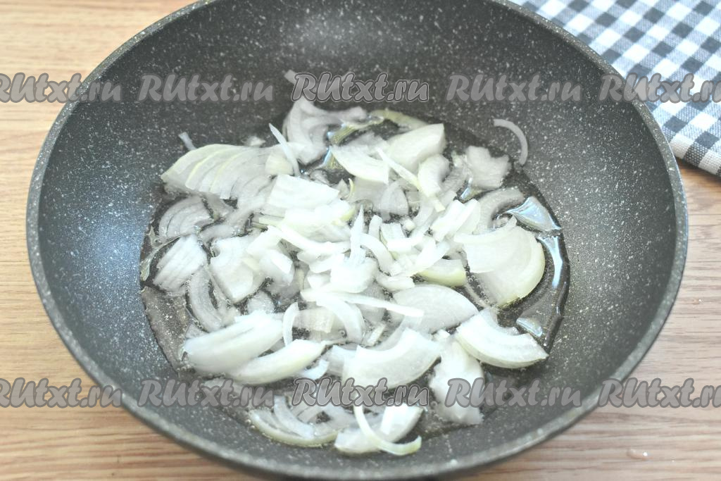 Очищаем лук и морковь. Луковицу нарезаем на четверть кольца (или полукольца). Прогреваем в сковороде растительное масло, выкладываем лук и на среднем огне, периодически перемешивая, обжариваем его 3 минуты.