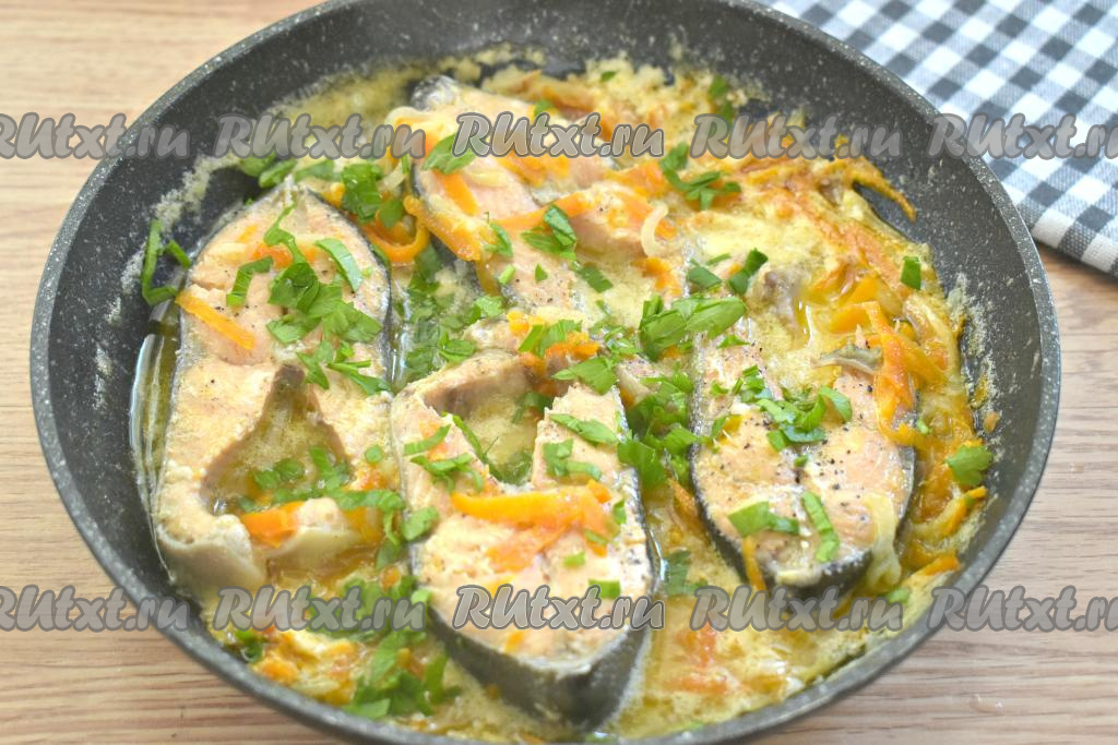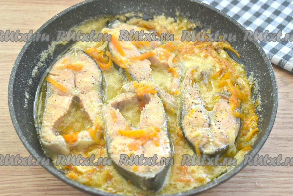 После закипания соуса из сметаны убавляем огонь до ниже среднего, накрываем сковороду крышкой и тушим горбушу с луком и морковью 20 минут.