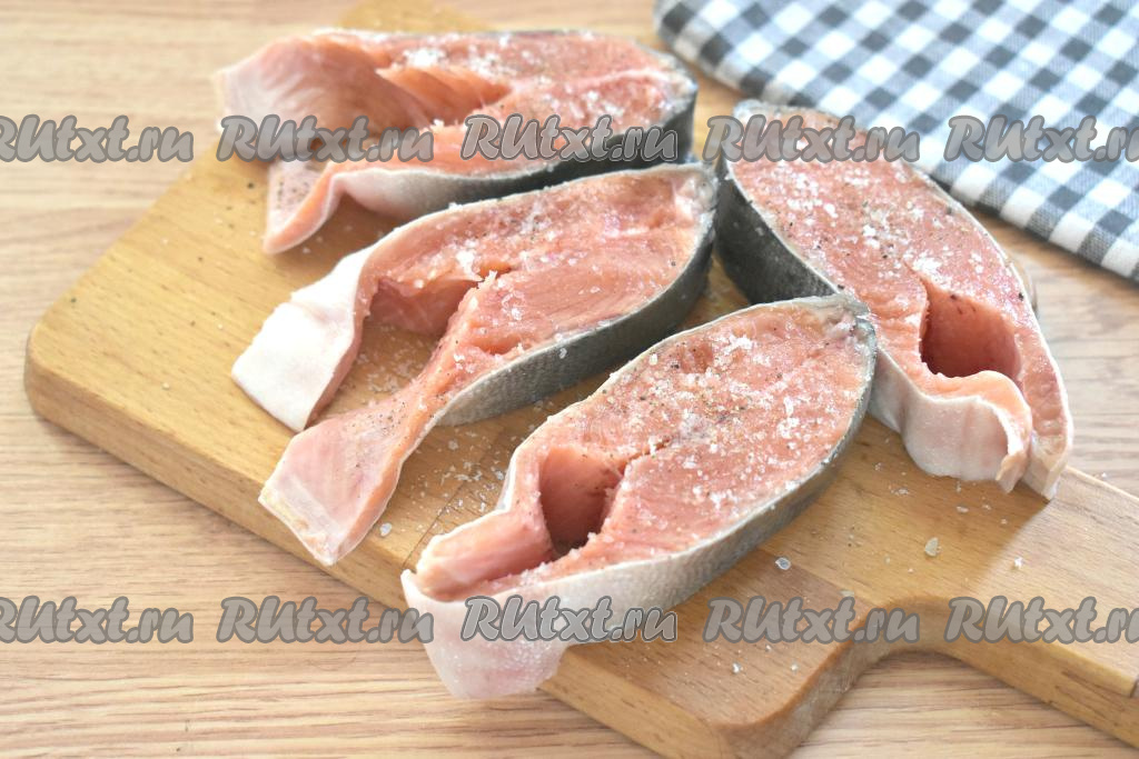 Если горбуша заморожена, её нужно полностью разморозить, удалить голову и внутренности, тщательно промыть водой. Подготовленную горбушу нарезаем на порционные кусочки (стейки) толщиной около 2 сантиметров. Я взяла 4 порционных стейка. Солим и перчим горбушу по вкусу.