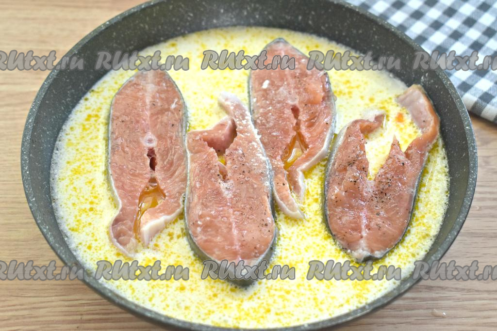 Практически полностью заливаем кусочки горбуши сметанным соусом и ставим сковороду на сильный огонь.