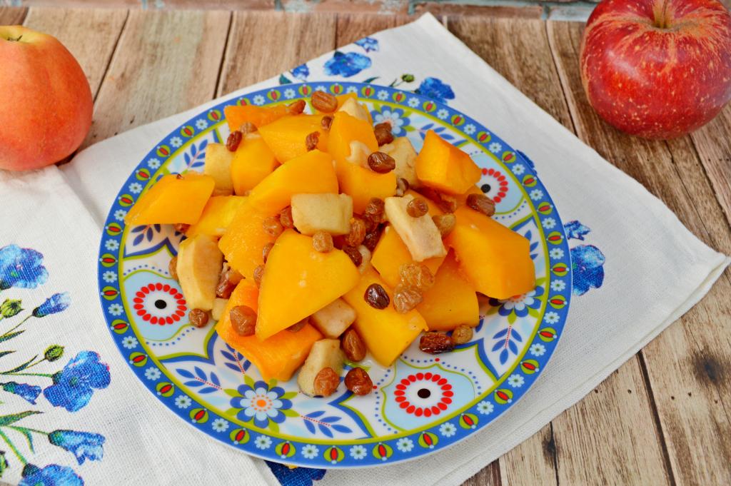 Тыква с яблоками и изюмом, запечённые в духовке, получились в меру сладкими, аппетитными и очень вкусными. Я подала это блюдо к столу в качестве десерта.