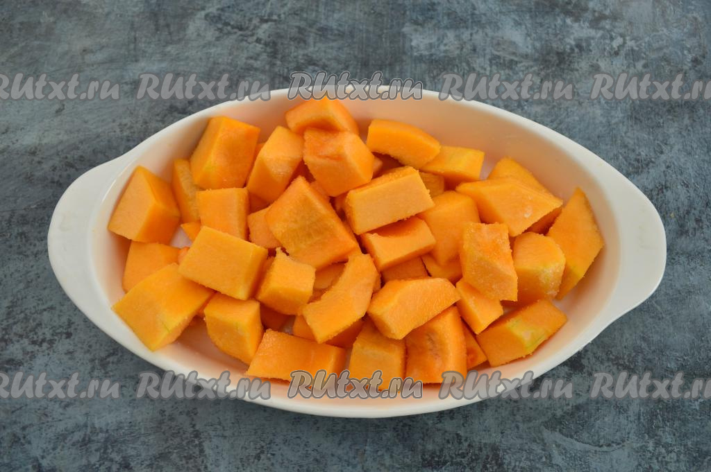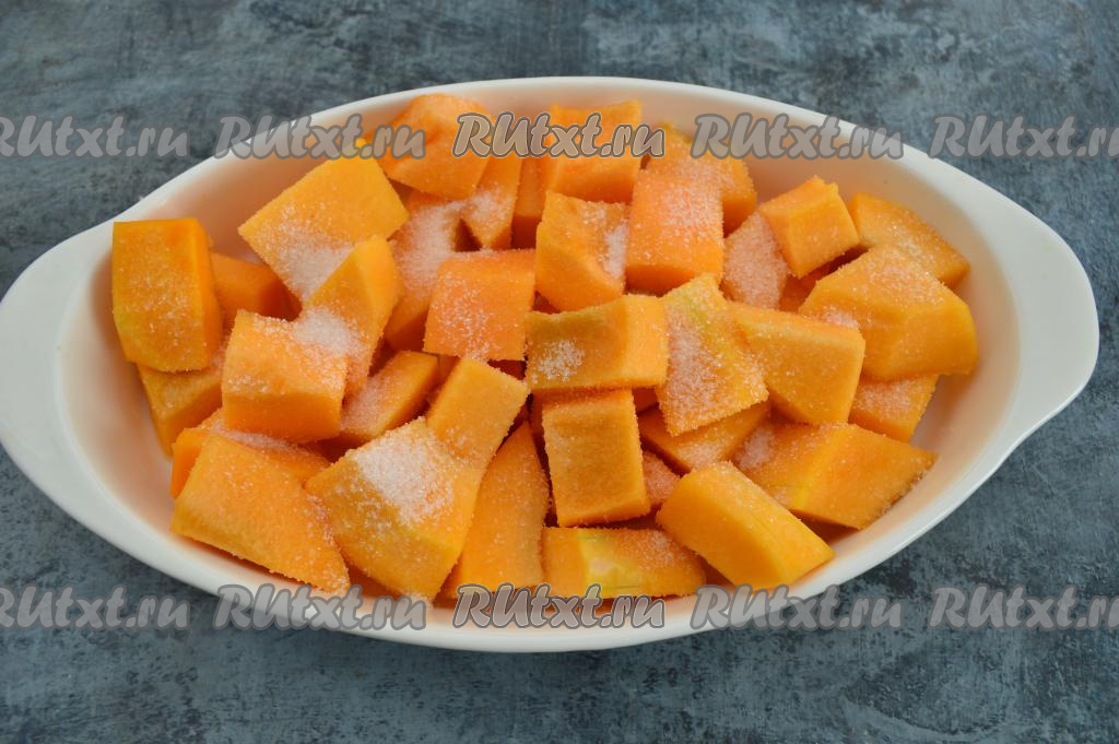 Тыкву очистить от кожуры и волокон с семенами. Нарезать 600 грамм очищенной тыквы на кусочки размером 3 на 4 сантиметра. В форму для запекания (я решила запекать в форме размером 26 на 16 сантиметров) налить 2-3 столовых ложки воды и выложить в неё кусочки тыквы. Посыпать тыкву сахаром, перемешать. У меня тыква была достаточно сладкая, поэтому двух столовых ложек сахара мне вполне хватило.