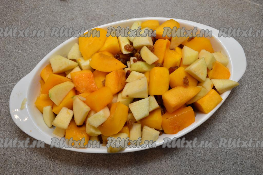 Сразу к тыкве с изюмом добавить яблоки, перемешать.