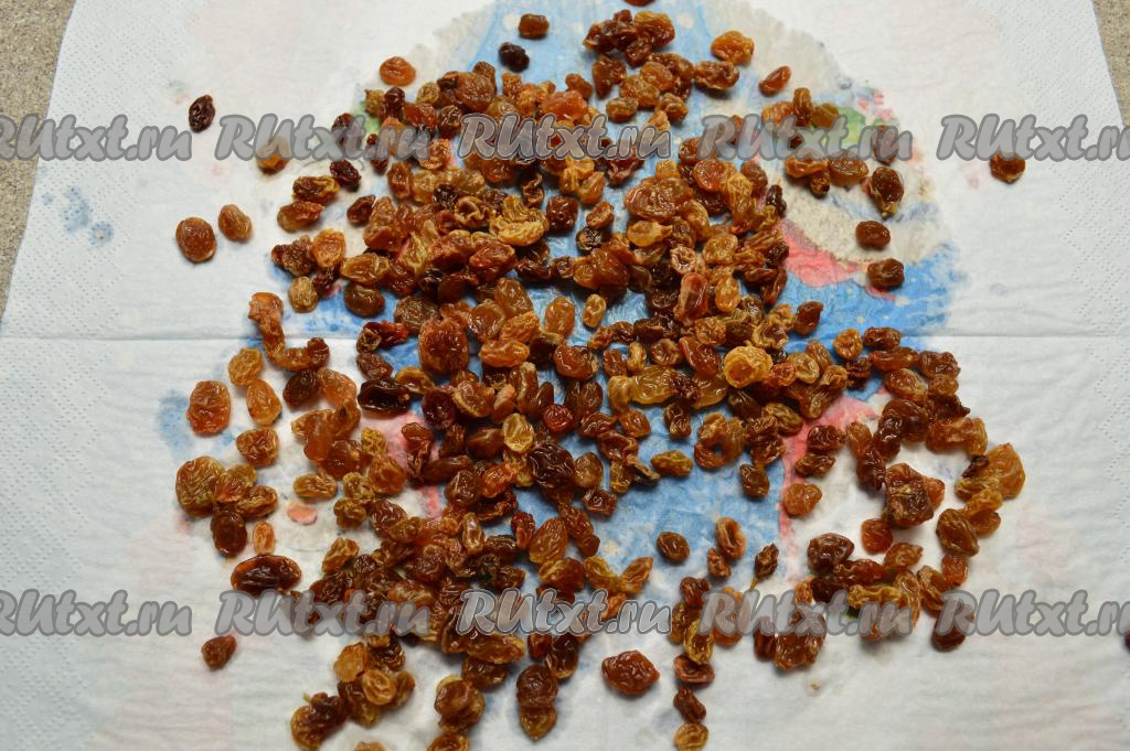По прошествии 5 минут слить воду с изюма, промыть его холодной водой, разложить на бумажном полотенце и оставить минут на 10-15, чтобы изюм обсох. Если есть изюм с веточками, тогда удалите эти веточки.