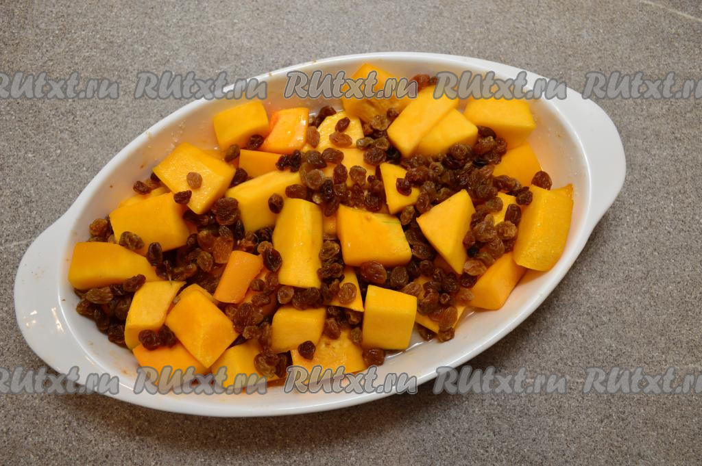 Когда запечённая тыква станет достаточной мягкой (по прошествии 30-35 с момента запекания), добавить обсушенный изюм, перемешать.