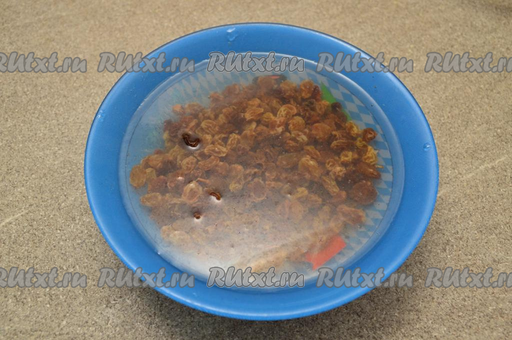 Изюм выложить в тарелку, залить полностью кипятком и оставить его минут на 5.