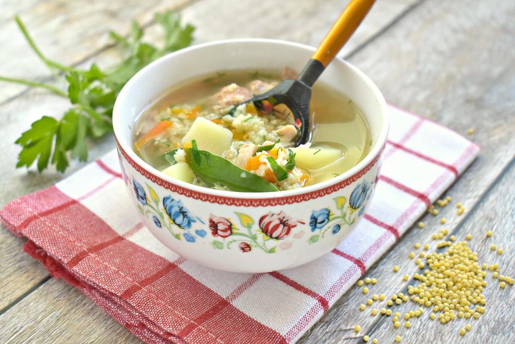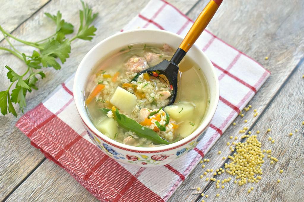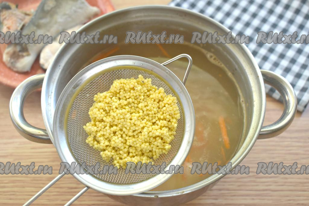 Тщательно промываем пшено, откидываем его на сито, чтобы стекла лишняя жидкость. Крупу добавляем в рыбный бульон вслед за картошкой и морковью. После закипания варим уху на небольшом огне 20 минут.